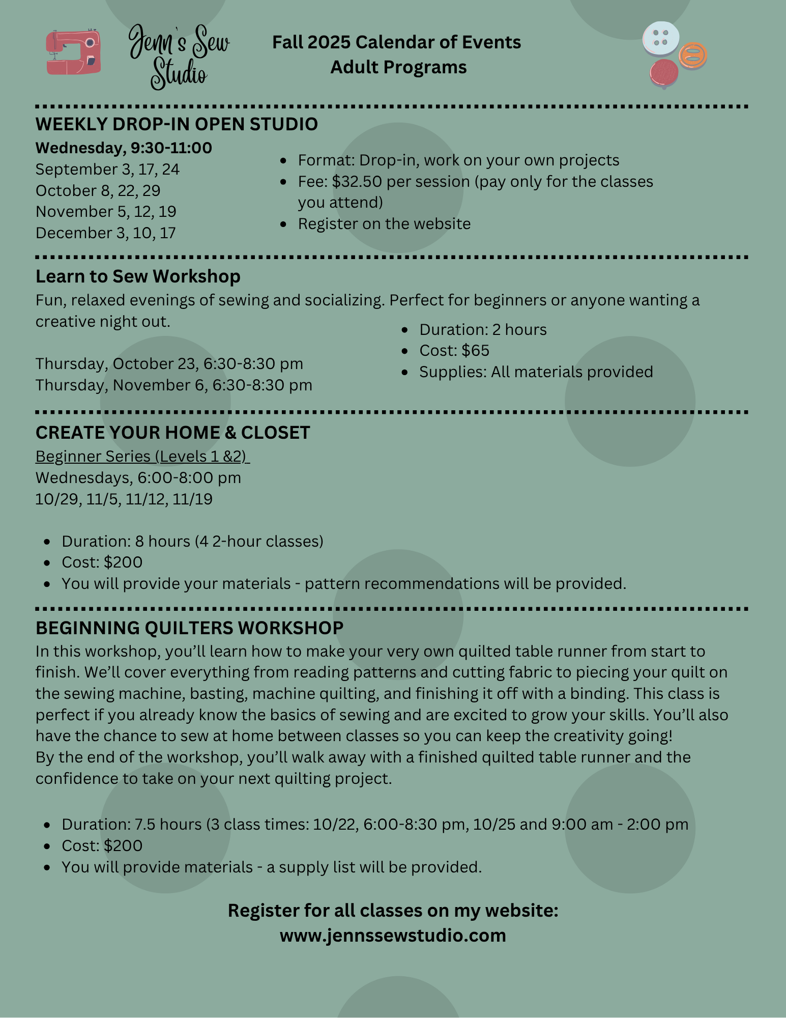 We offer weekly classes for both adults and kids, camps and workshops designed to empower creators of tomorrow. Whether learning the basics or mastering advanced techniques, we’re here to support every step. Using the Kids Can Sew curriculum and the Sewciety Kids program for weekly classes and a wide variety of patterns for workshops and camps, students of all ages will have the opportunity to develop their sewing skills. Both of these curiculums will guide students through progressive patterns to go from being a just a beginner to being able to create your very own styles!!